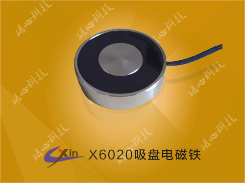 X6020吸盤電磁鐵,是由直徑60mm,高度20mm ,表面有防水灌封膠組成的一種電磁鐵。