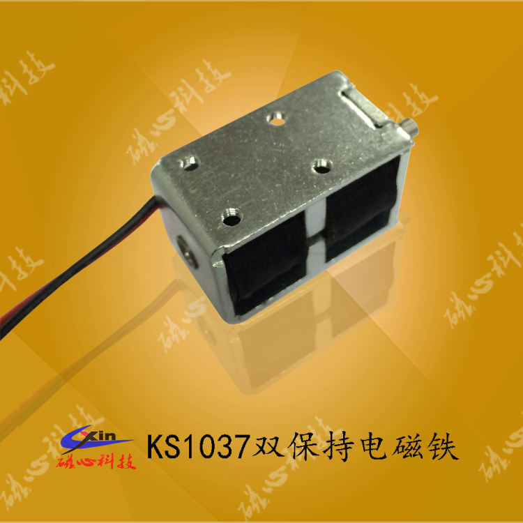KS1040雙保持電磁鐵屬于微型推拉式電磁鐵,具有雙保持功能,產品可以在沒通電的情況下在永磁鐵的作用下保持在一個位置,保持力的大小可根據客戶的要求設定。電磁鐵廠家--磁心